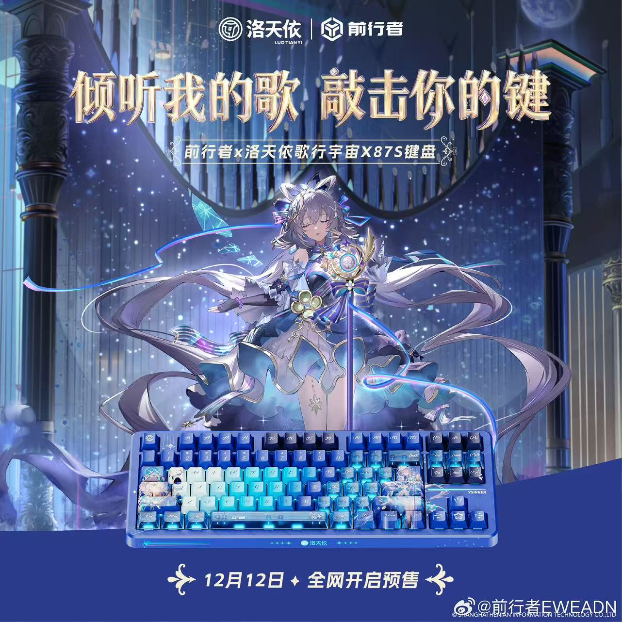 前行者于前日发布以“洛天依歌行”为设想焦点的X87S键盘,采用PC高透键帽搭配RGB光效,视觉上呼应虚拟歌姬的科技感取艺术性,键帽或融入洛天依专属元素,将于12月12日预售。前行者于前日发布以“洛天依歌行”为设想焦点的X87S键盘,采用PC高透键帽搭配RGB光效,视觉上呼应虚拟歌姬的科技感取艺术性,键帽或融入洛天依专属元素,将于12月12日预售。共同五层消音填充材质,优化按键手感分歧性并空腔音。