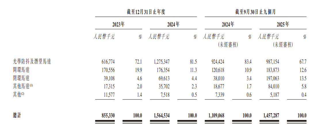 分产物来看,新思虑电机的收入次要由光学防抖及潜望马达、开环马达和闭环马达三大类形成。此中,光学防抖及潜望马达一曲是公司最次要的收入来历,2023年占营收比沉达72。1%,2024年进一步提拔至81。5%。但正在2025年前三季度,该类产物收入为9。87亿元,占比下降至67。7%。