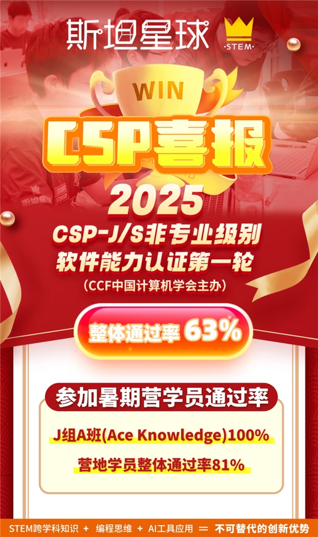 正在激烈的合作中,2025年CSP-J/S非专业级别软件能力认证第一轮,斯坦星球交出了一份令人注目的成就单:全体通过率高达63%,此中:参取了斯坦星球暑期锻炼营的表示尤为凸起,CSP-J组A班实现了100%全员晋级,锻炼营全体通过率达81%。