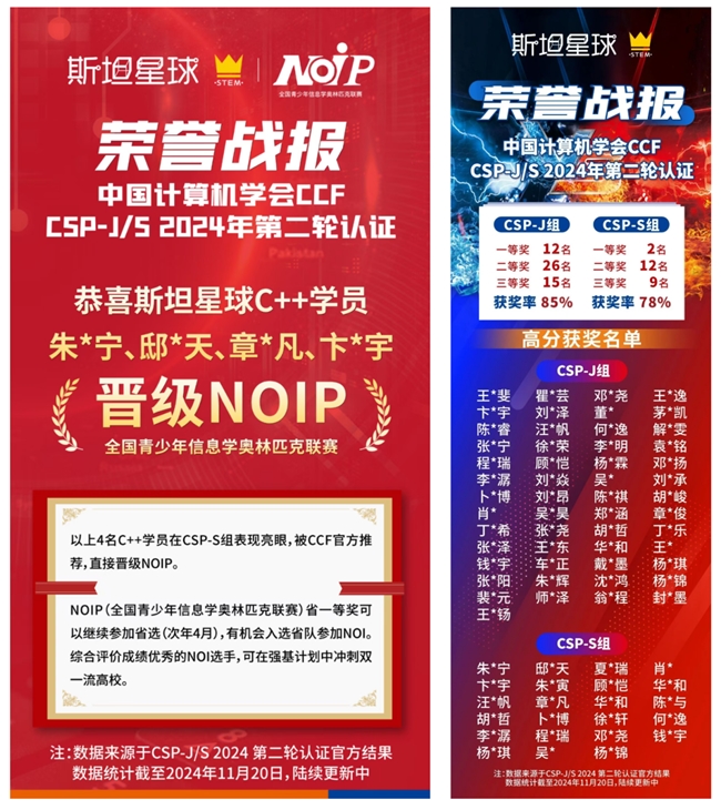 而正在2024年CSP-J/S首轮认证中,斯坦星球也同样表示优异:CSP-J组斩获85%超高获率,CSP-S组斩获78%超高获率!值得一提的是,朱*宁、邸*天、章*凡、还成功晋级NOIP(全国青少年消息学奥林匹克联赛)!