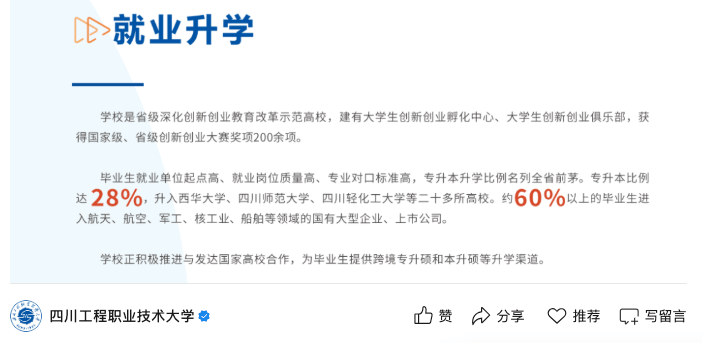 四川工程职业手艺大学位于四川省德阳市,可能会下认识认为这所高校并不怎样样。学校前身为建立于1959年的第一机械工程部德阳沉型机械制制学校,严酷意义上来说是具有部下布景的。而正在我国,只需是具有部下布景的高校,绝大大都就业前景都不会太差,即即是职业手艺大学,也不破例。四川工程职业手艺大学亦是如斯,学校最新发布的就业数据显示,结业生有60%以上都能进入航空航天、军工、核工业、船舶等范畴的国有大型企业和上市公司就业!